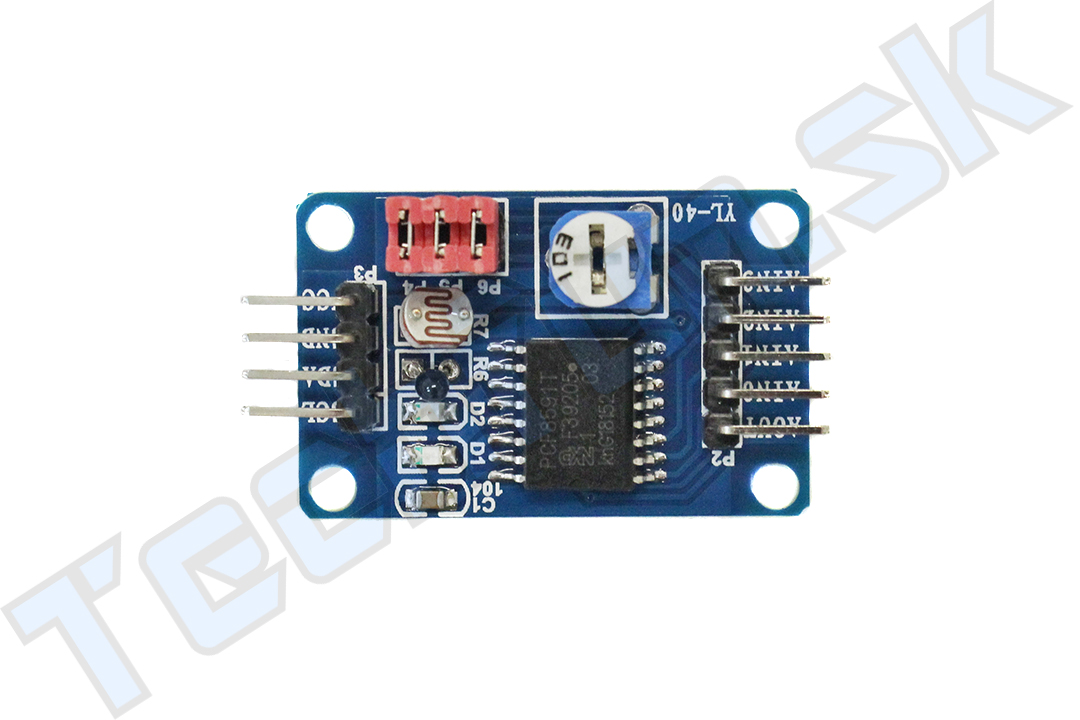 Kromě toho je na modulu AIN1 připojen termistor, na pin AIN0 fotorezistor a potenciometr připojen na pin AIN3. Jednotlivé periferie můžeme odpojit díky jumperům. P4 odpovídá thermistoru, P5 odpovídá fotorezistoru a P6 trimru. Výstup AOUT je připojen na zelenou diodu modulu.