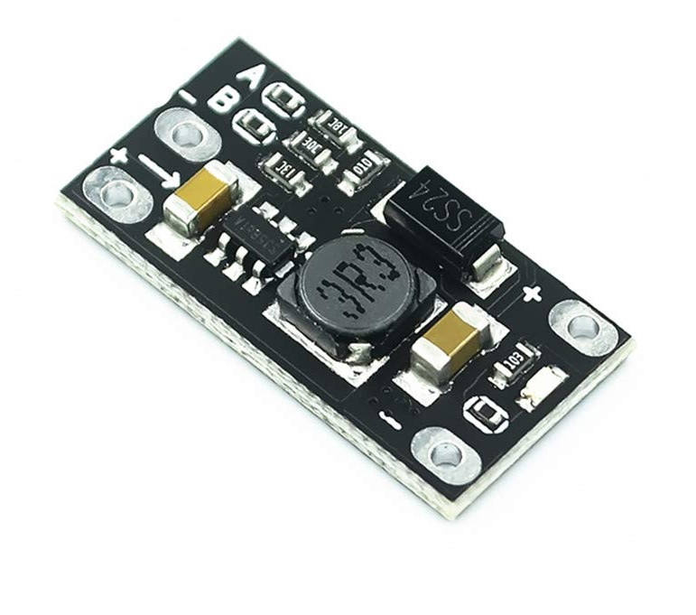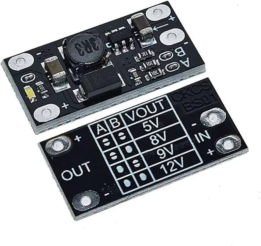 Jednoduchý DC-DC step-up měnič napětí, vhodný pro napájení projektů z baterií. Modul umožňuje 4 různé výstupy podle toho, jak jsou zkratovány plošky A a B: