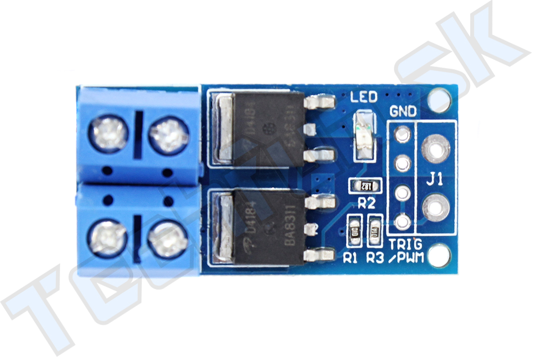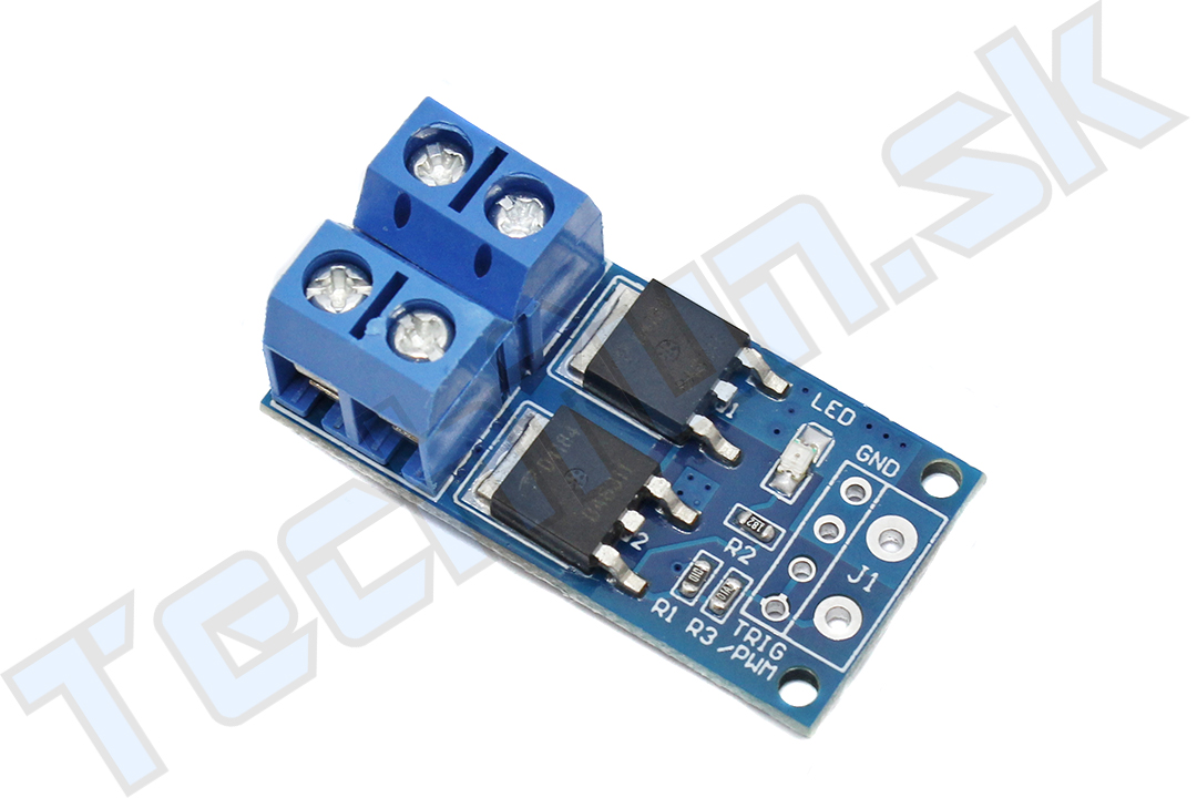 Díky dvěma MOSFET tranzistorům zapojeným paralelně lze vytvářet PWM signál a tedy ovládat například rychlost otáčení DC motorků, ventilátorů nebo jiných zařízení používajících motor. Použité výkonové tranzistory umožňují řídit motory s odběrem až do 20A. Chcete-li ovládat i směr otáčení, budete potřebovat více takových modulů zapojených například v H-bridge konfiguraci.