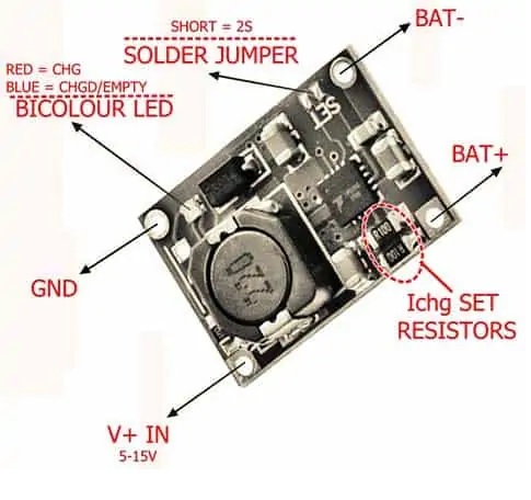 Výborný maličký nabíjací obvod so štandardným nabíjacím protokolom – konštantný prúd. Nabíjací prúd 2 A je len na začiatku, pri úplne vybitých článkoch (2,5-3V). Z výroby nastavené koncové napätie 4,12 V prispieva k predĺženiu životnosti li-ion článkov. Možný výstup na dvojfarebnú led so spoločnou anódou, ideálne modro červenou.Odporúčam.