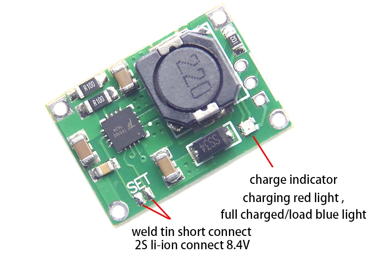 Modul umožňuje nabíjení lithiových baterií v konfiguraci 1S nebo 2S. Nastavení je možné pomocí zkratovacího jumperu. Pokud jsou plošky SET seskratovány, nabíjení je 2S (8.4V) pokud nejsou zeskratovány tak 1S (4.2V). Modul má zabudované indikační diody a indikační vývody. Při nabíjení 2S se doporučuje zapojit také balancer pro baterie.
