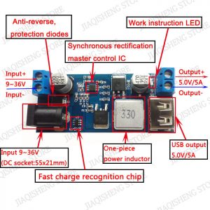 Měnič napětí směrem dolů ze vstupního napětí 9V – 36V na stabilizované výstupní napětí 5V. Doporučený stálý výstupní proud modulu je do 5A, avšak zvládne i krátkodobou zátěž 6A. Na desce se nachází výstupní USB konektor (i klasické 5mm svorky) a vstupní DC-005 socket (i klasické 5mm svorky).